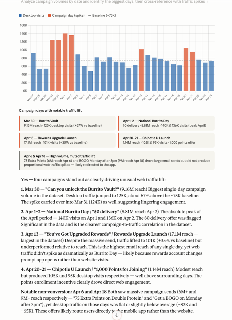 We then uploaded these key marketing campaigns to Claude and asked how effective campaigns were at driving mobile traffic.