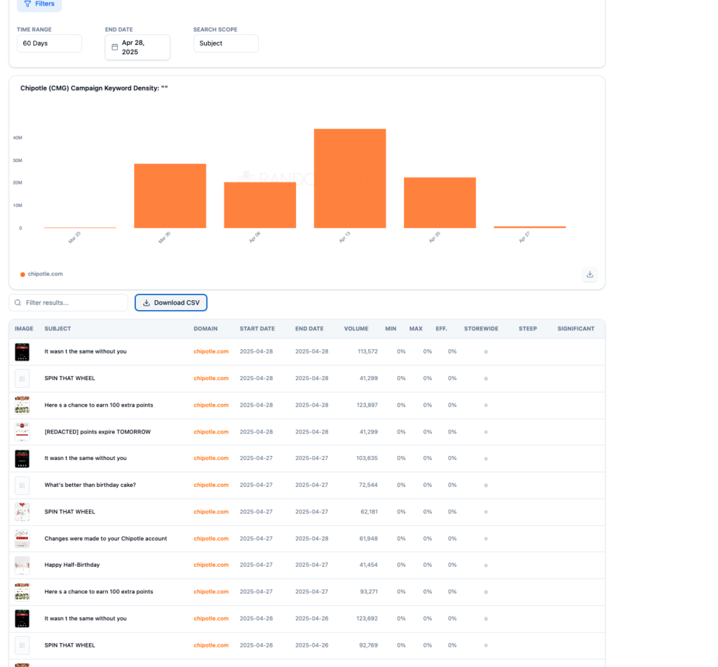Random Walk Campaign Search Allows Ingestion of Any Email Marketing Promotion Our new web dashboard allows downloading of nearly 400 brands email marketing campaigns for analysis. Below, we uploaded all campaigns for Chipotle for March-April 2026 and the prior year