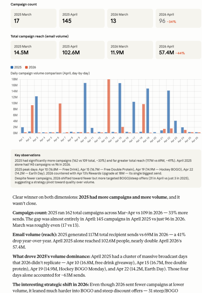 Below: Using Claude paired with Random Walk & Similarweb, we can see Chipotle has substantially modified their promotional strategy this spring.